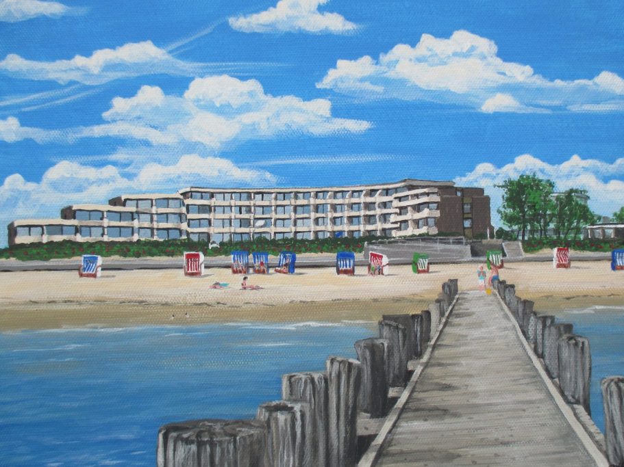 Das Bi de Wyk von der Südstrandbrücke aus gesehen. Auch dieses Bild war eine Auftragsarbeit, bei der die erste Version, weil Ansicht im Winter, recht trist wirkte. Mit ein paar Strandkörben habe ich einfach den Sommer einziehen lassen.