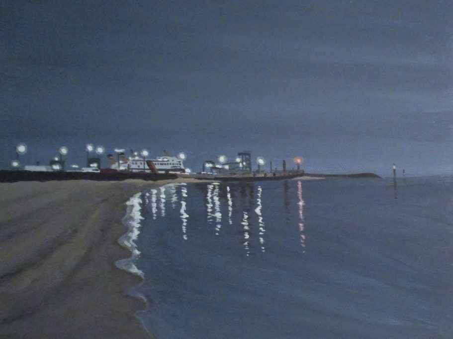 Inspiriert zu diesem Bild wurde ich von dem Anblick, der sich bietet, wenn es zum ablaufenden Wasser die Menschen ins Watt zieht und eine Fähre vorbei fährt. Für mich sah es irgendwie so aus, als waren die Leute gerade ausgestiegen.